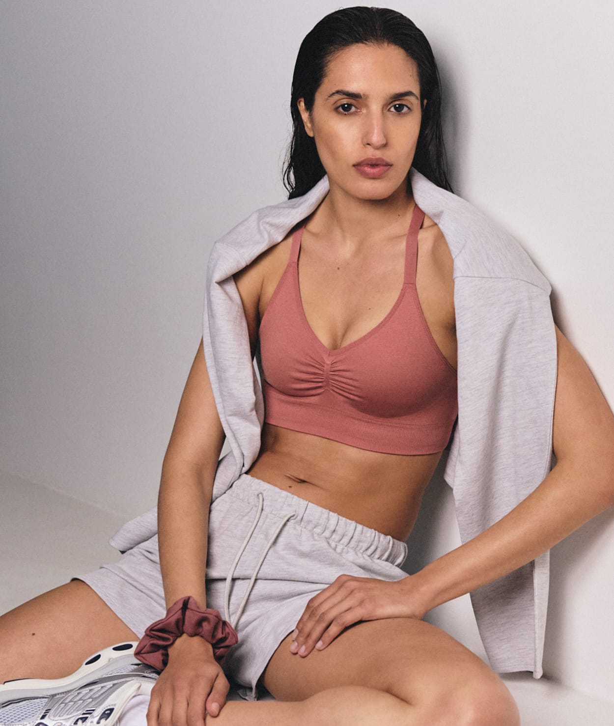 Gracias a un material sin costuras y sus almohadillas removibles, este bra deportivo ofrece una comodidad óptima para una libertad de movimiento total. Sus tirantes ajustables y cruzados en la espalda se adaptan perfectamente a la silueta. Con sus delicados fruncidos en el escote y su detalle de gota de agua en la espalda, aporta un toque de estilo.