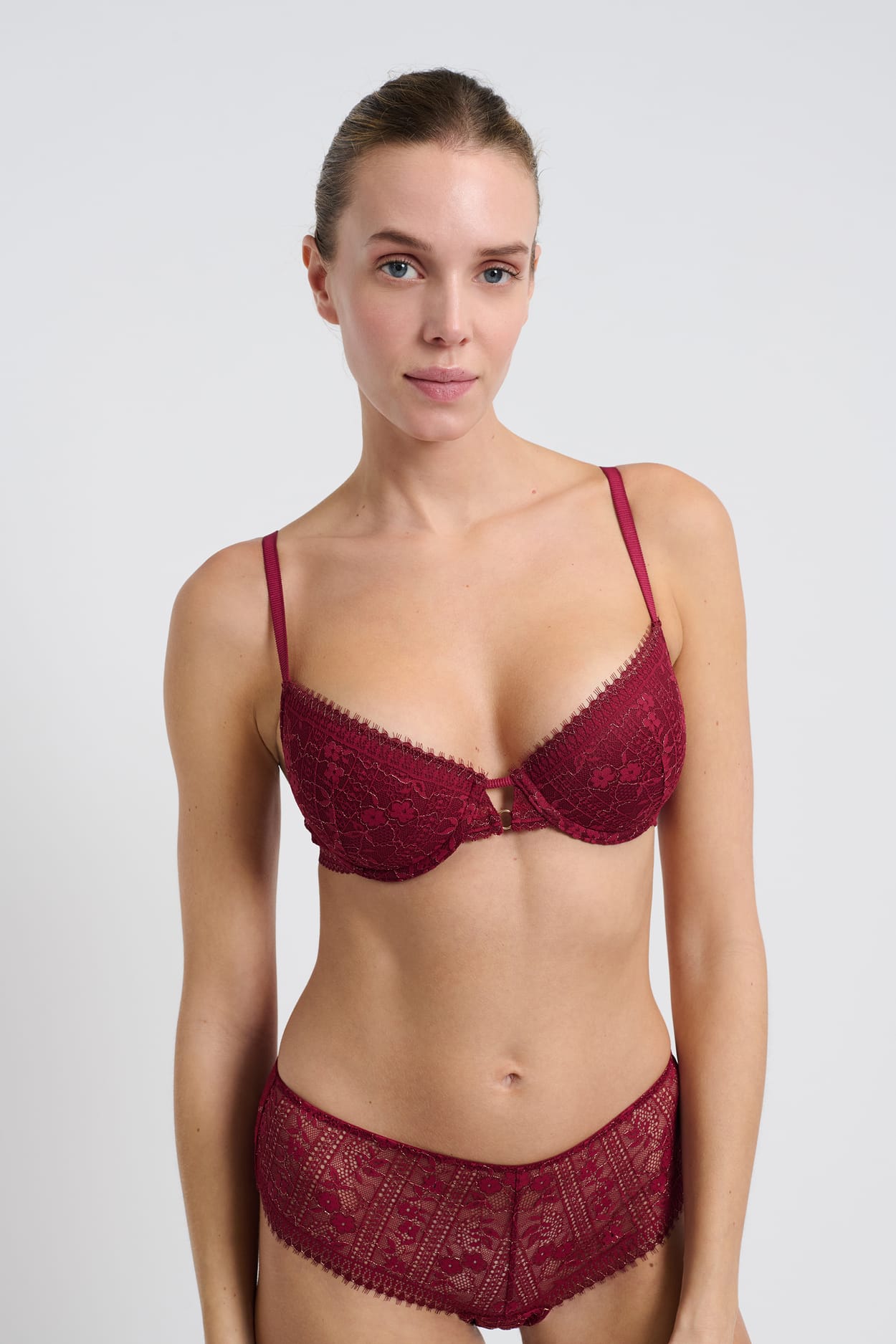 Ses coques fines galbent naturellement le décolleté, tandis que l’anneau à l’entrebonnet et la double bretelle au dos signent une pièce élégante.