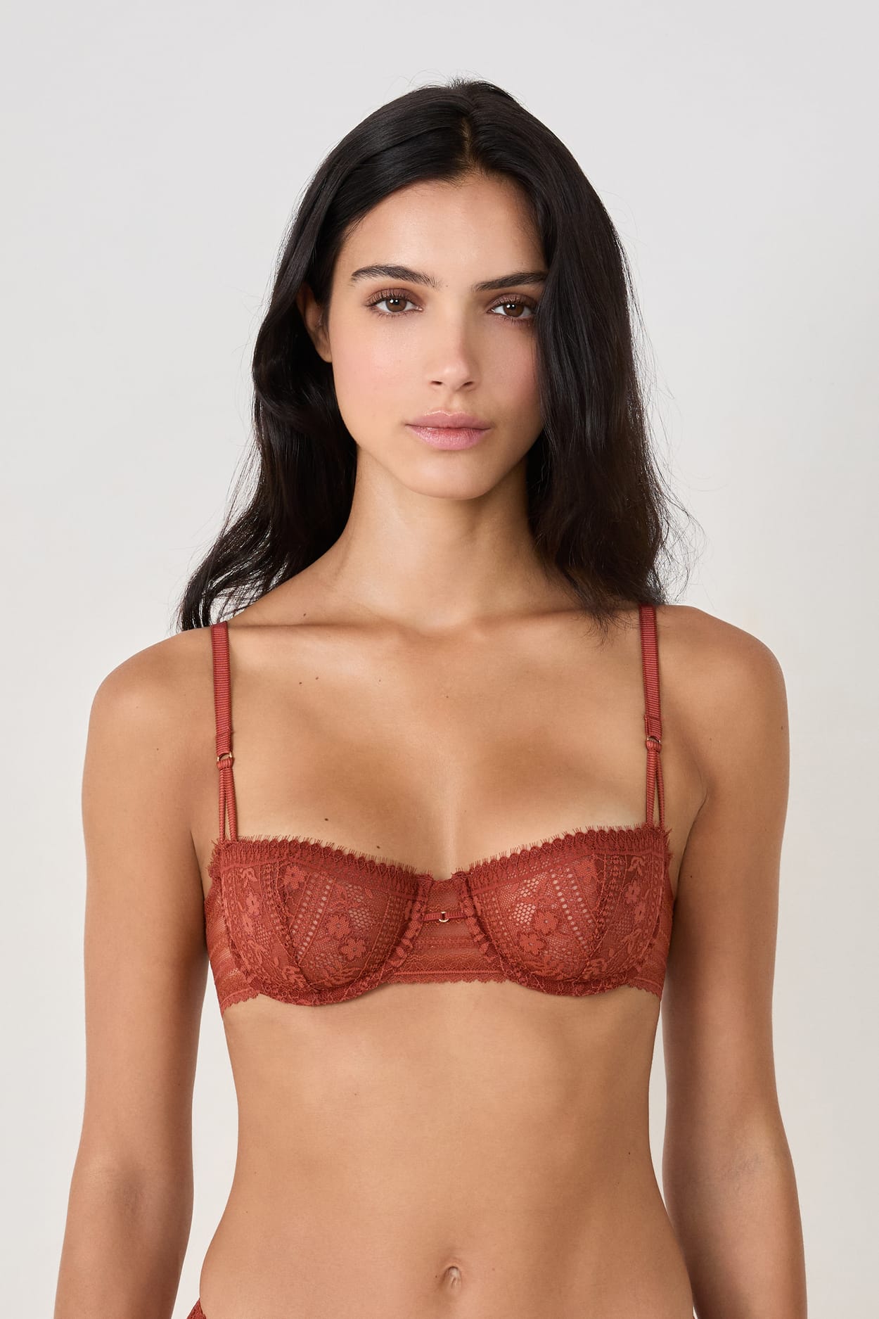 La nueva lencería de diario que es sexy y cómoda a la vez . Este bra balconnet sin copas combina encaje floral efecto pestañas con rayas gráficas. Sin aros, realza el busto de forma natural, mientras que los tirantes dobles de la parte delantera añaden un toque de elegancia.