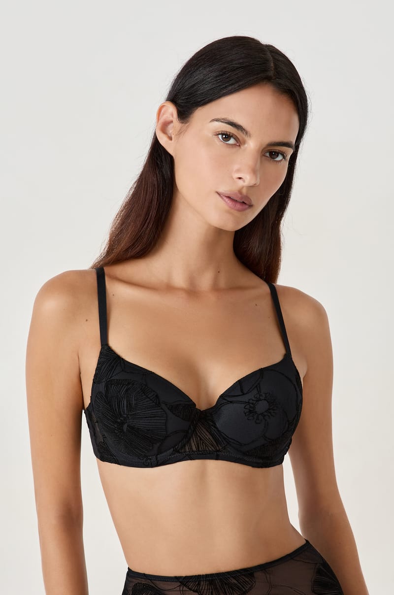 Elegante y refinado, este sujetador apuesta por una forma clásica con copas finas. Confeccionado en tul y realzado con bordados, es la prenda perfecta para realzar tu lencería.