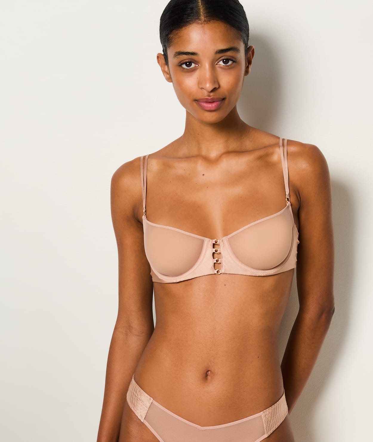 La seda y el tul crean una de las líneas lenceras más sexy de la temporada con combinaciones que destacan por su elegancia atemporal. ¡Encuentra las prendas del mismo conjunto! • brasier sin relleno • Aros • Aberturas escote • Seda y tul • Tirantes ajustables • Cierre trasero • Anillas doradas • La modelo mide 176cm y lleva una talla S/36