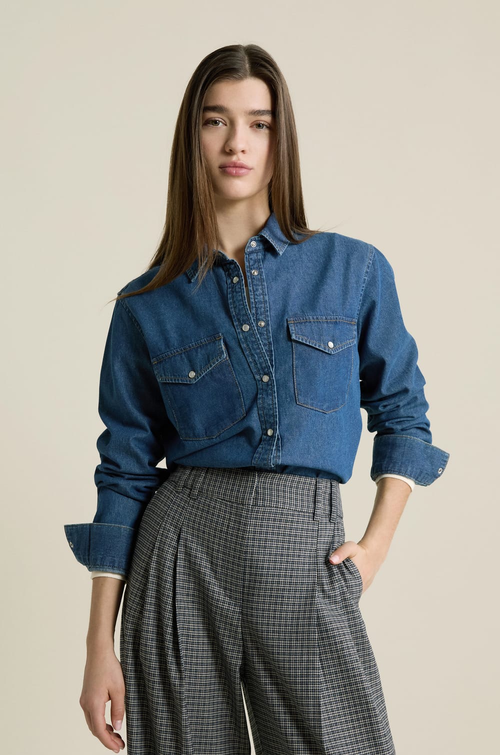 Una pieza versátil para llevar a diario, esta Camisa de manga larga con efecto denim combina comodidad y estilo workwear. Cuello estructurado, botones contrastados, bolsillos y cierres abotonados, detalles trabajados que subrayan su carácter atemporal.