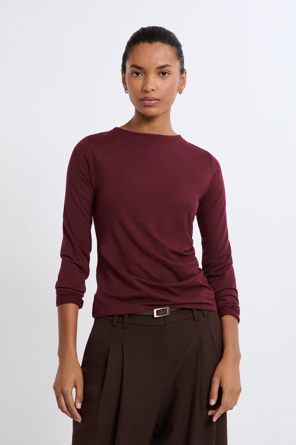 Para llevar sola o combinada con otras prendas, esta camiseta de manga larga y cuello redondo presenta un corte ajustado. Un básico atemporal de la temporada.