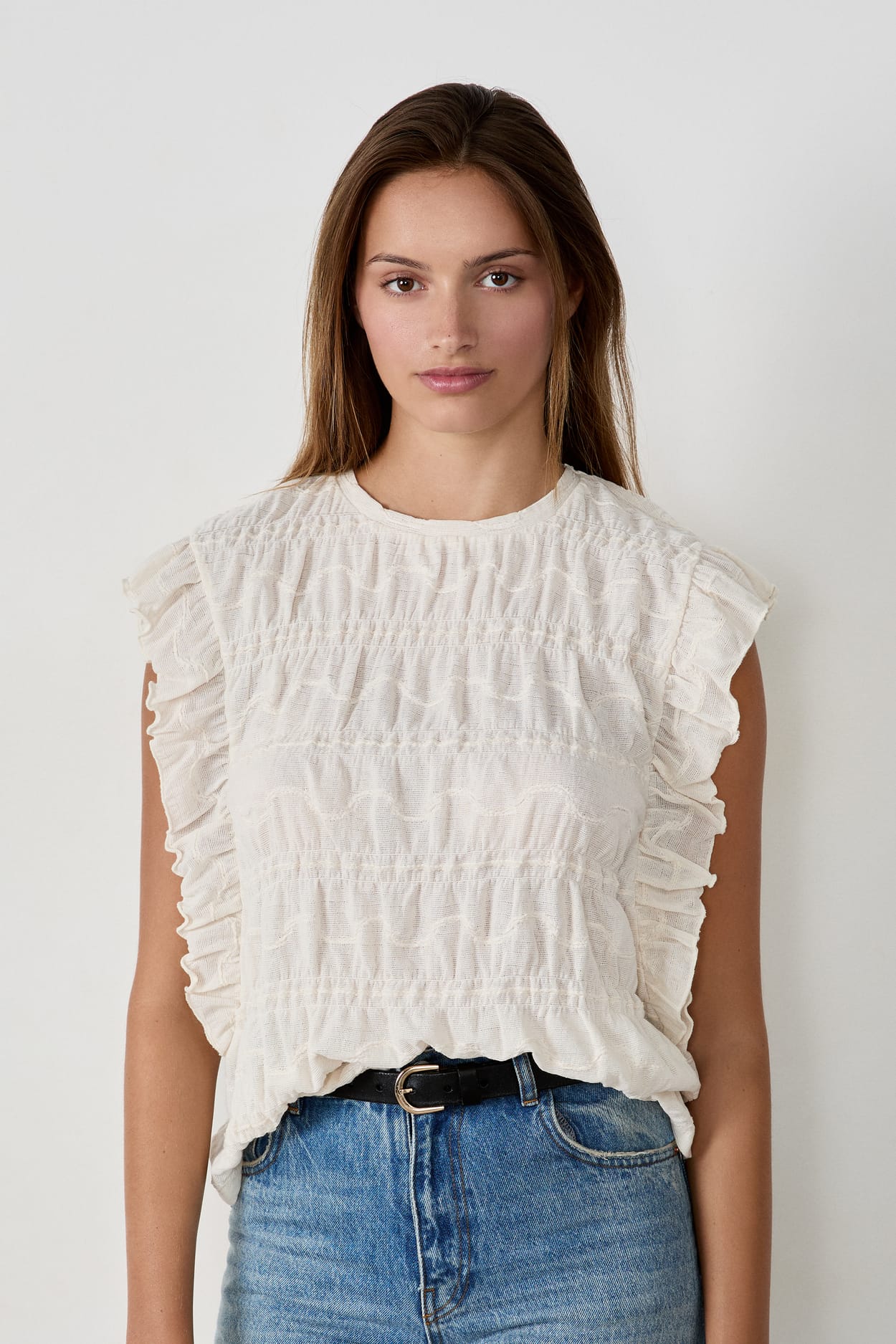 Aérien et délicat, ce t-shirt sans manches se distingue par un effet smocké. Il est réhaussé par des volants sur les côtés apportant texture et volume.