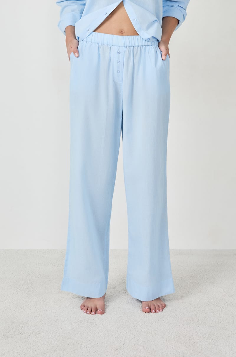 Suaves y reconfortantes, estos Pantalón de pijama están confeccionados en algodón. Su corte amplio y fluido aporta ligereza y movimiento, realzado por tres delicados botones bajo la cintura.