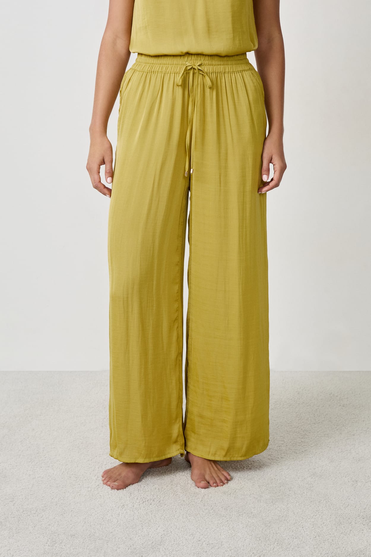 Pantalón de pernera ancha y delicado acabado satinado que ofrece la comodidad perfecta para una noche acogedora. Añade el Top a juego para completar el look.