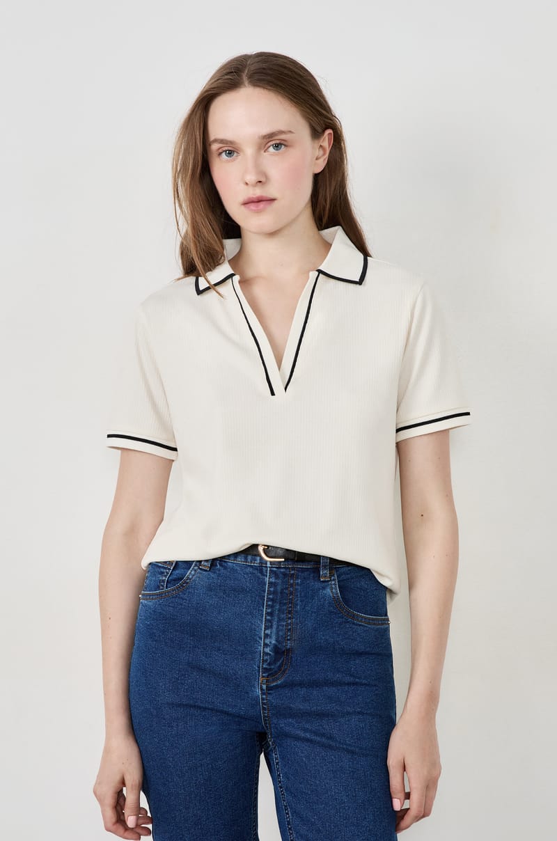 Elégant et intemporel, ce polo manches courtes est confectionné en coton. Muni d'un col V, il est twisté par des liserés contrastés au niveau des épaules et du col.