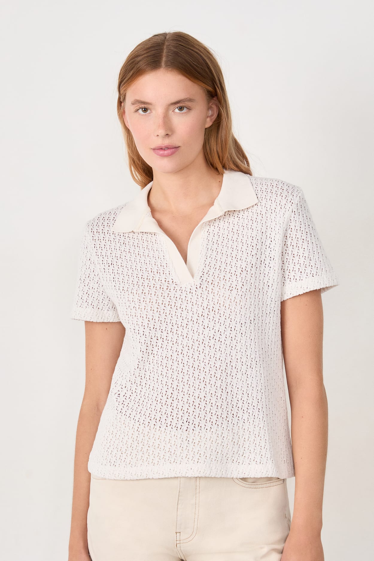 Muni d'un col chemise et de manches, ce t-shirt se pare de détails ajourés qui insufflent une allure aérienne.