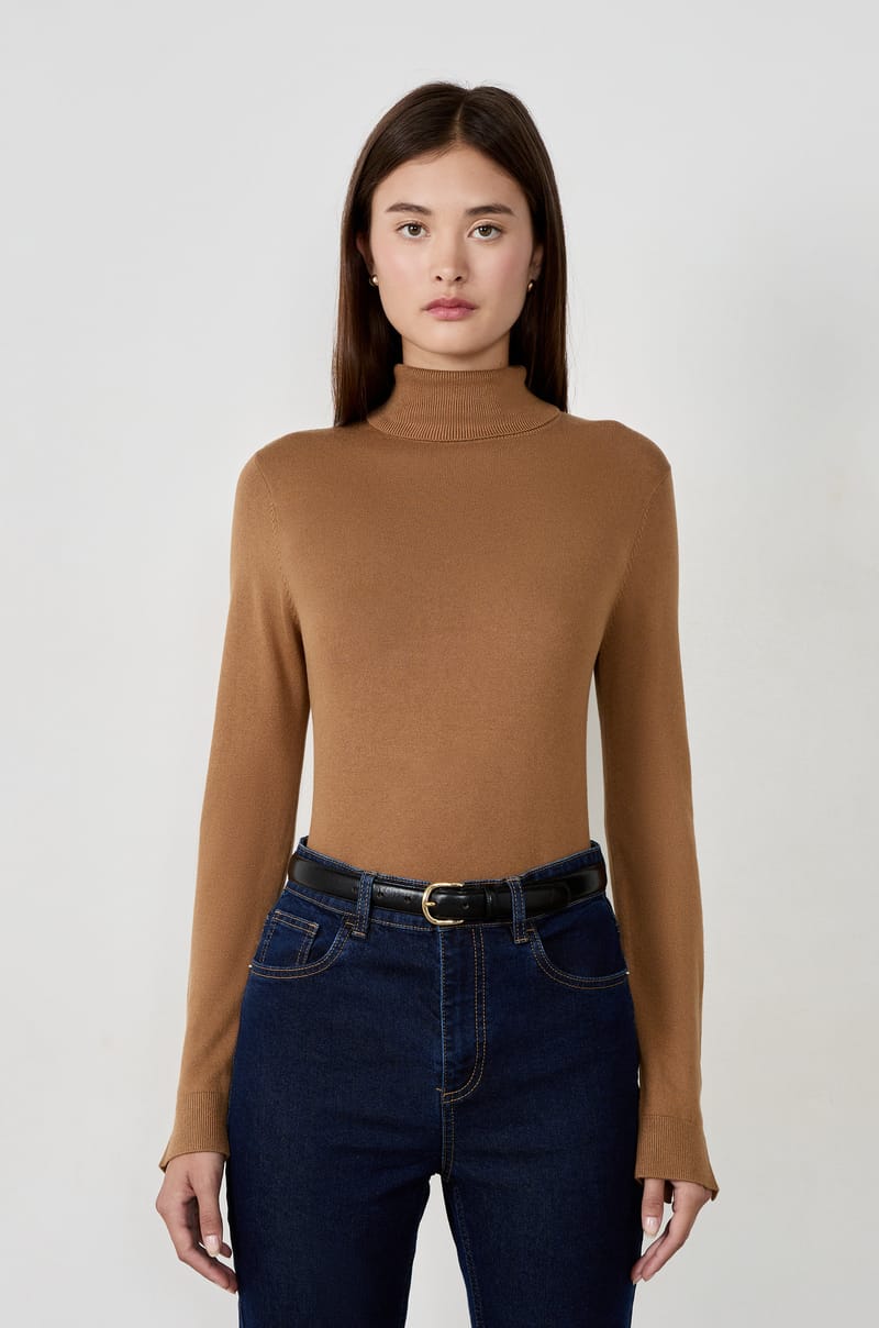 Confeccionado en punto fino y suave, este suéter de cuello vuelto se ajusta delicadamente a la silueta. Sus cuidados aca...