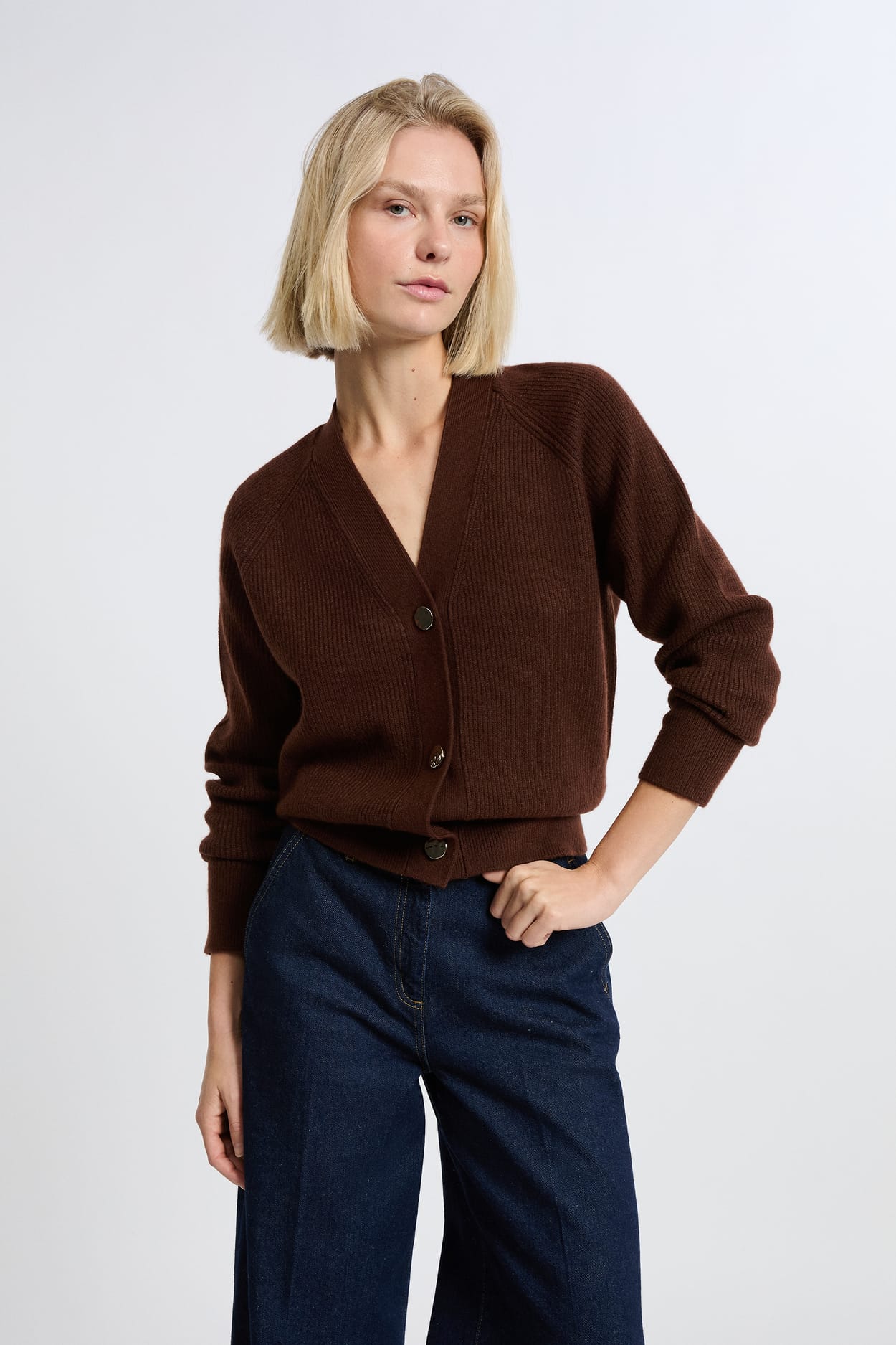 Basique intemporel du vestiaire, ce gilet manches longues est confectionné en maille. Il est réhaussé d'un effet côtelé et d'une fermeture à boutons dorés.