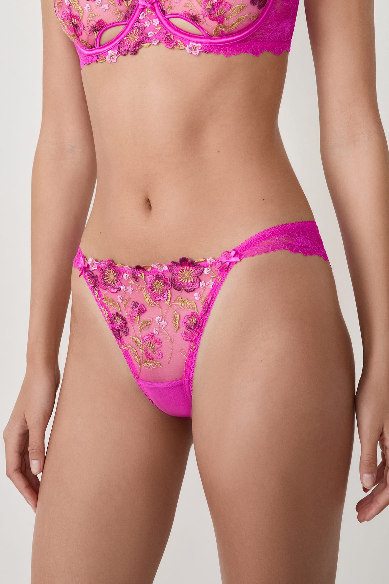Sobre el encaje y el tul de esta tanga, los bordados florales se dibujan en trompe-l'œil para un look delicado. Apuesta por los detalles con sus pequeños lazos.