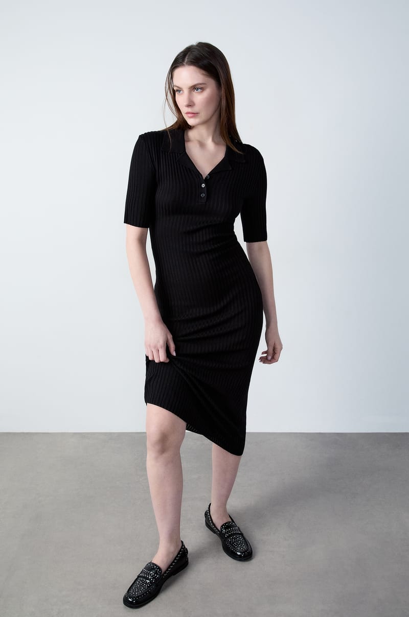 Delicadamente acanalada, este vestido largo encarna la elegancia. Con sus mangas cortas y cuello tipo camisa, redefine las curvas y aporta mucho estilo.