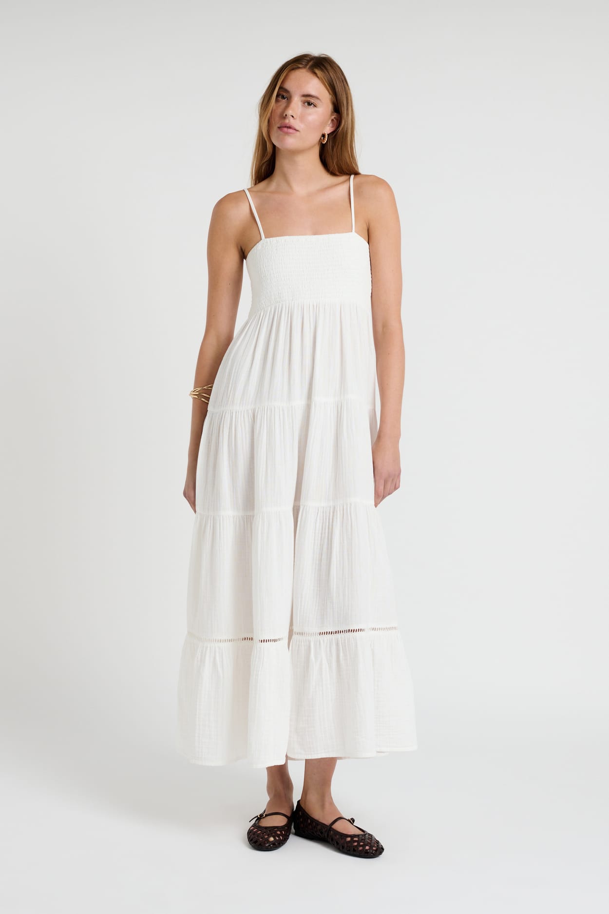 Avec sa coupe fluide, cette robe longue à fines bretelles est sublimée par une texture délicate et des broderies travaillées sur plusieurs niveaux. Le dernier détail ajouré joue avec la transparence pour une allure légère et élégante.